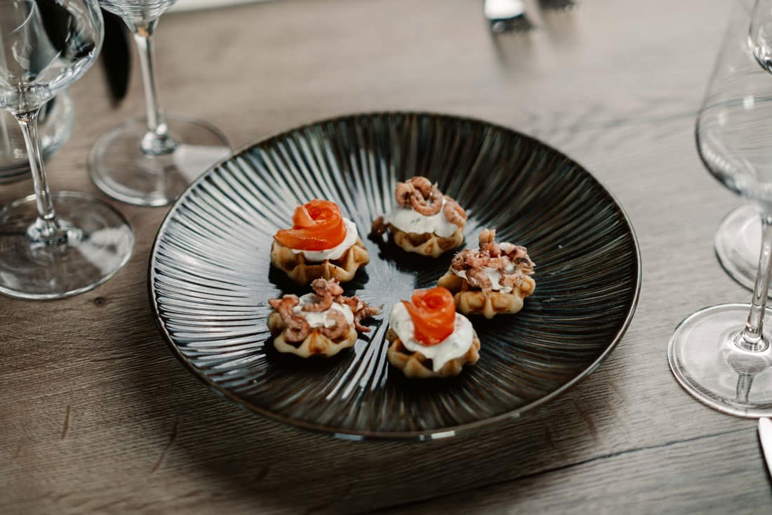 3. Gaufres de pommes de terre, crème aigrelette, saumon fumé ou crevettes grises
