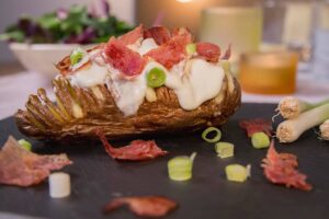 Courgettes farcies à la crème de pommes de terre, lard et persil