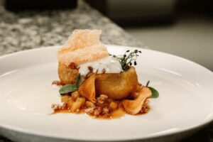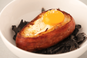 Barque de pomme de terre, risotto et espuma de pomme de terre, lardon et fromage
